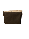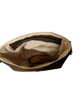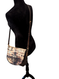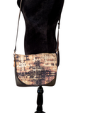 This Beautiful Bag was constructed with chocolate brown Faux Leather and Tim Holtz London Gridlock themed cotton. Measures 9 inches wide by 12 inches high. Features interior zippered pocket and faux leather crossbody strap.