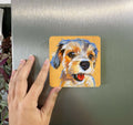 Acrylic painting of a fluffy friend on a 4" x 4" square, wooden magnet. Everything made by hand, and includes materials.