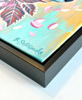 An original oil painting, 2024. Created with oil and acrylic paint on canvas. 12x16 inches. Black faux wood float frame included with hanging hardware installed on the back.